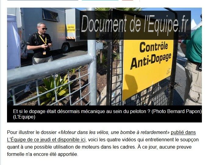 Toujours est-il qu'après les nombreux scandales de dopage dans différentes disciplines, on parle maintenant, pour ce qui est du cyclisme, de dopage mécanique qui s'ajoute au chimique.